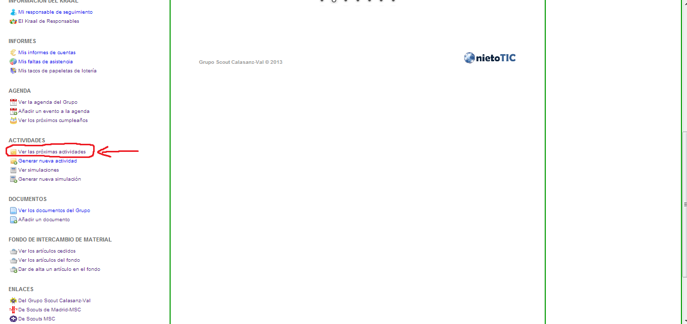 Si bajáis un poco, encontraréis «Actividades», con la opción de «Próximas actividades» (marcado en la segunda imagen). Clikando ahí, os aparecerá la siguiente pantalla: